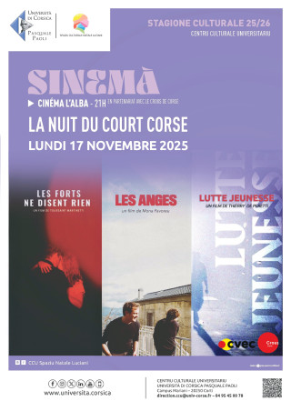 LES ANGES : Réalisation : Favoreu Mona Année de sortie : 2025 Genre : Drame Société de production : IUT de Corse Scénario : Mona Favoreu Acteurs principaux : Harold Orsoni, Davia Benedetti, Jean-Claude Benedetti, Carlu Dumenicu Bianchi, Jean-Dominique Rubini, Julia Raffini, Jean-Christophe Federicci Musique : Reprises de chants corses Pays d’origine : France